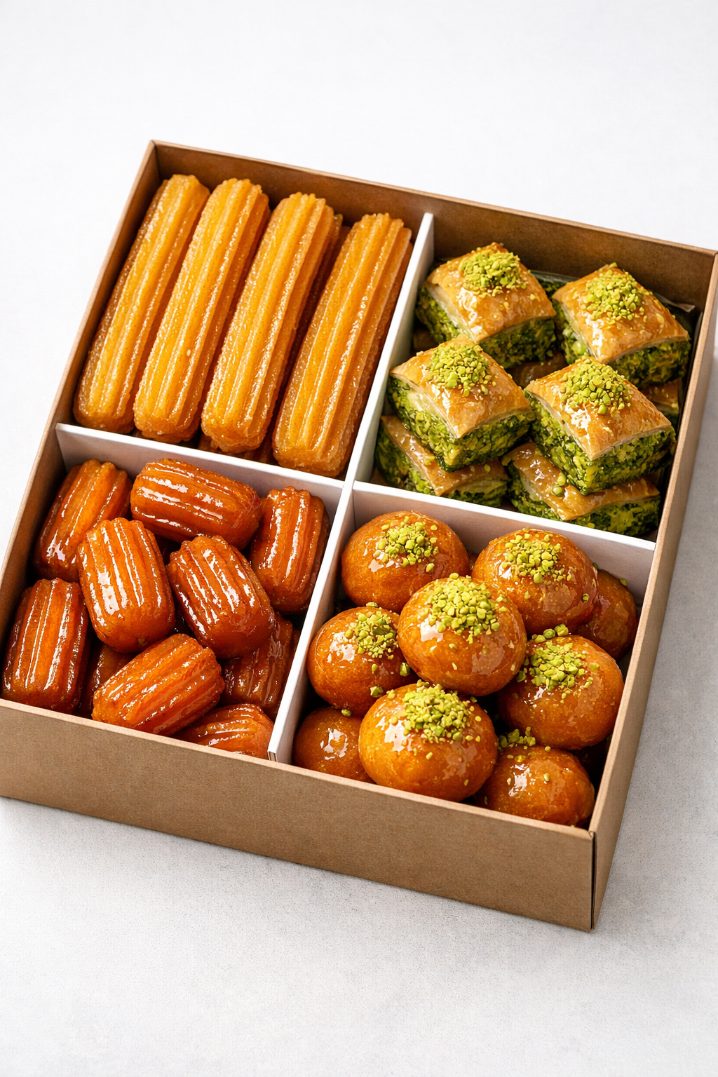 আমাদের প্রিমিয়াম ডেজার্ট কম্বো বক্সে রয়েছে চারটি জনপ্রিয় টার্কিশ মিষ্টান্ন — চুরোস, পেস্তা বাকলাভা, সিরাপ ভেজানো তুলুম্বা এবং লুকুমাদেস।